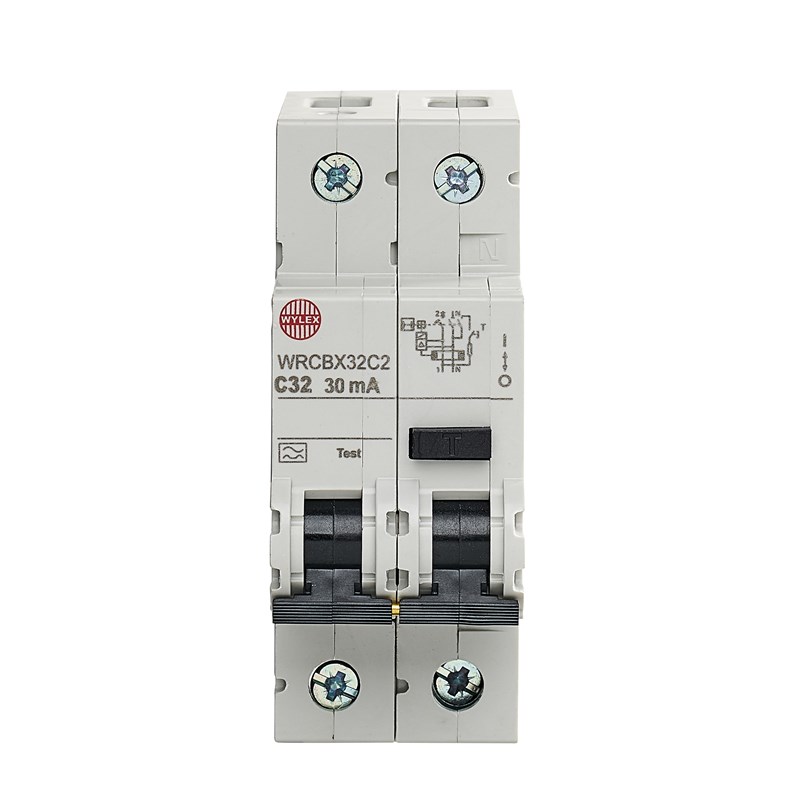 Two module, Bi-Directional RCBO (wire in wire out). 32A C curve (MCB), 30mA Type A (RCD). Single pole with switched neutral.