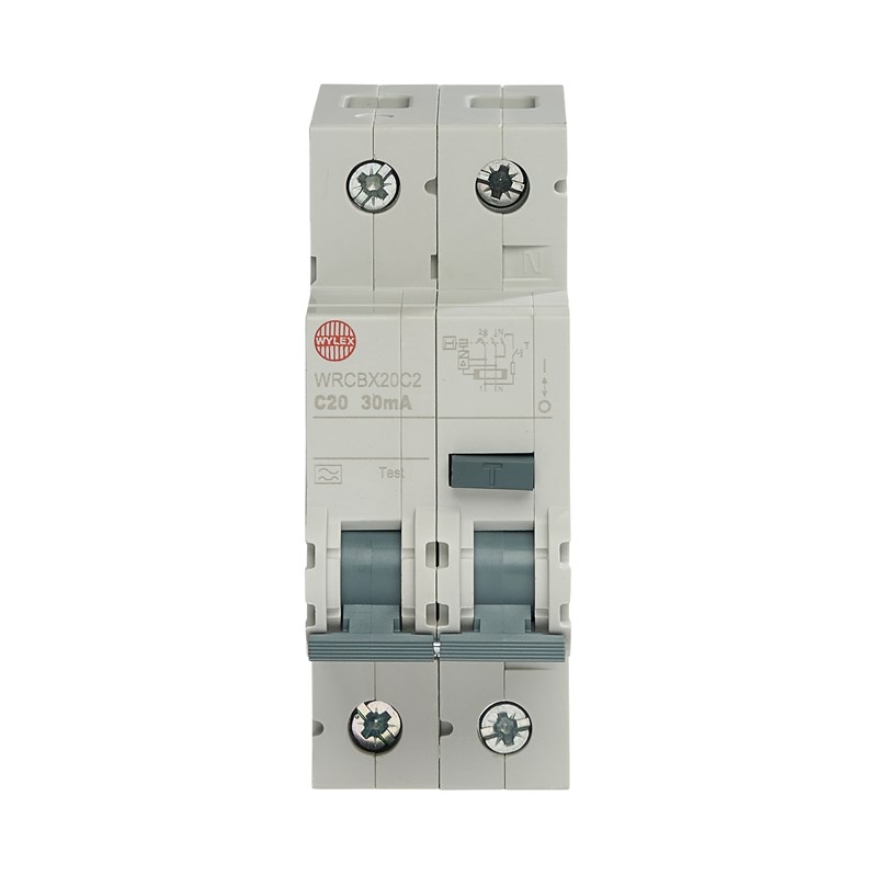 Two module, Bi-Directional RCBO (wire in wire out). 20A C curve (MCB), 30mA Type A (RCD). Single pole with switched neutral.