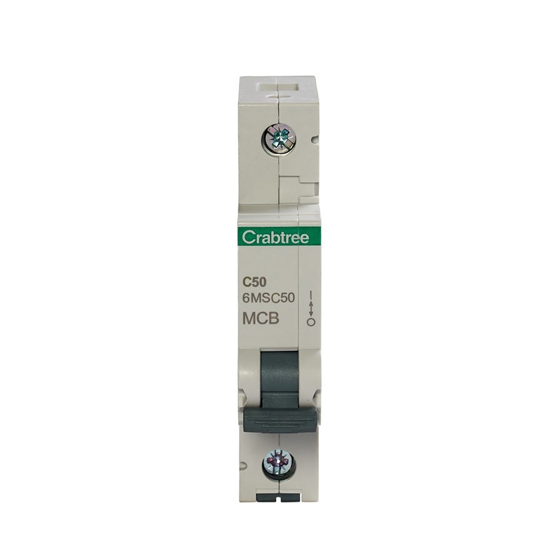 Single pole MCB, 50A C curve. Energy limiting Class 3. Quick release DIN clip. No miss busbar connection.