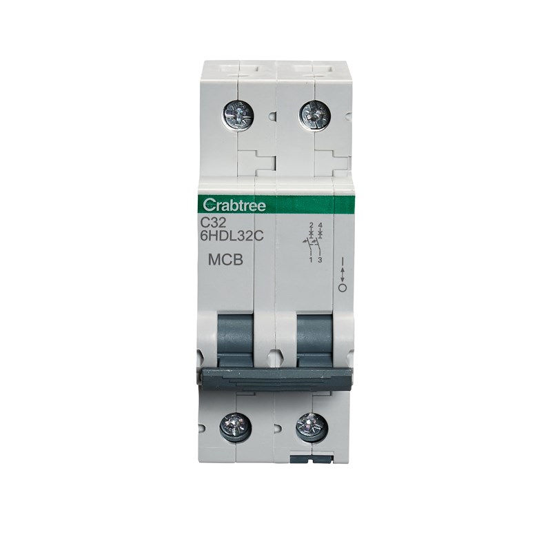 C curve trip characteristic (5-10In). Double pole MCB. 10 kA to BS EN 60898-1 (15 kA to BS EN 60947-2) @ 230 V AC. Energy limiting Class 3.