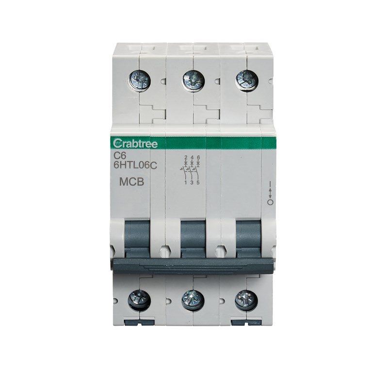 C curve trip characteristic (5-10In). Triple pole MCB. 10kA to BS EN 60898-1 (15kA to BS EN 60947-2) @ 240V AC. Energy limiting Class 3.