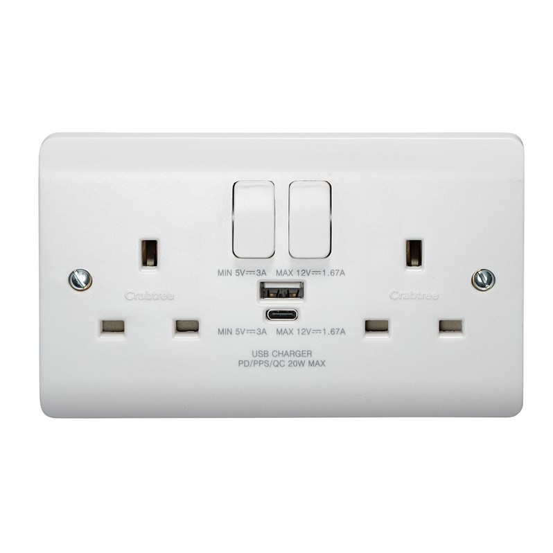 13A 2 Gang Single Pole Switched Socket with Type A and Type C 20W USB