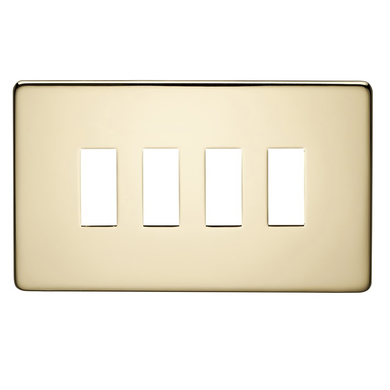 Screwless Plate. 4 Grid Aperture. Polished Brass Finish.