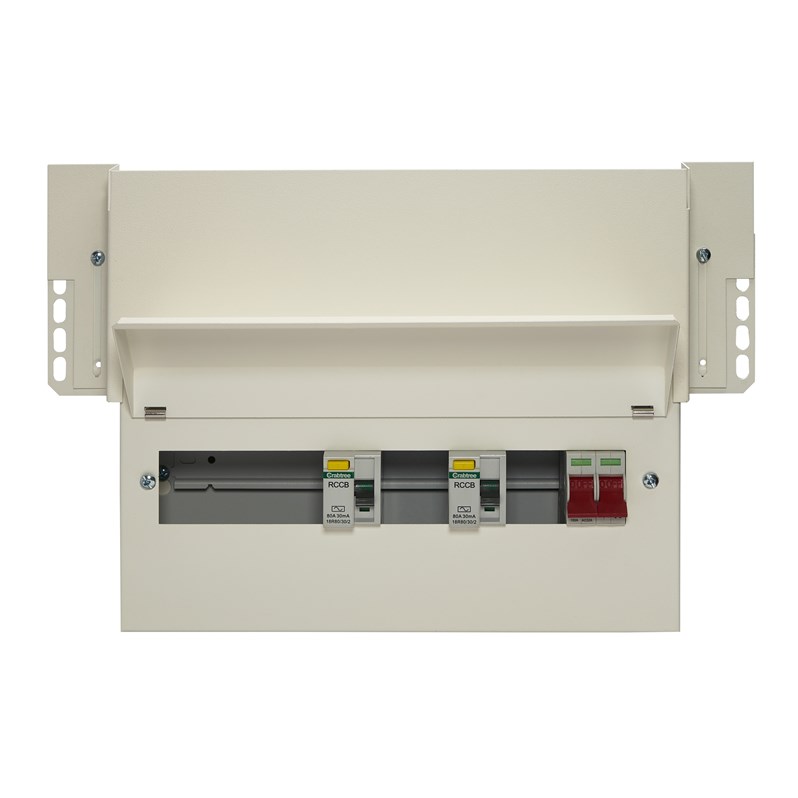 All metal meter cabinet consumer unit. Flexible busbar assembly. 10W Dual RCD. 430mm fixing centres.